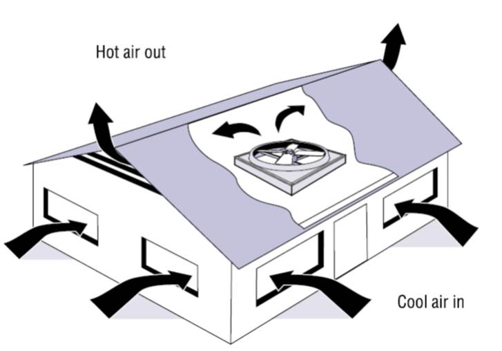 The fan draws in the cooler outside air through your open windows, and pushes that air through your attic space – cooling your house.